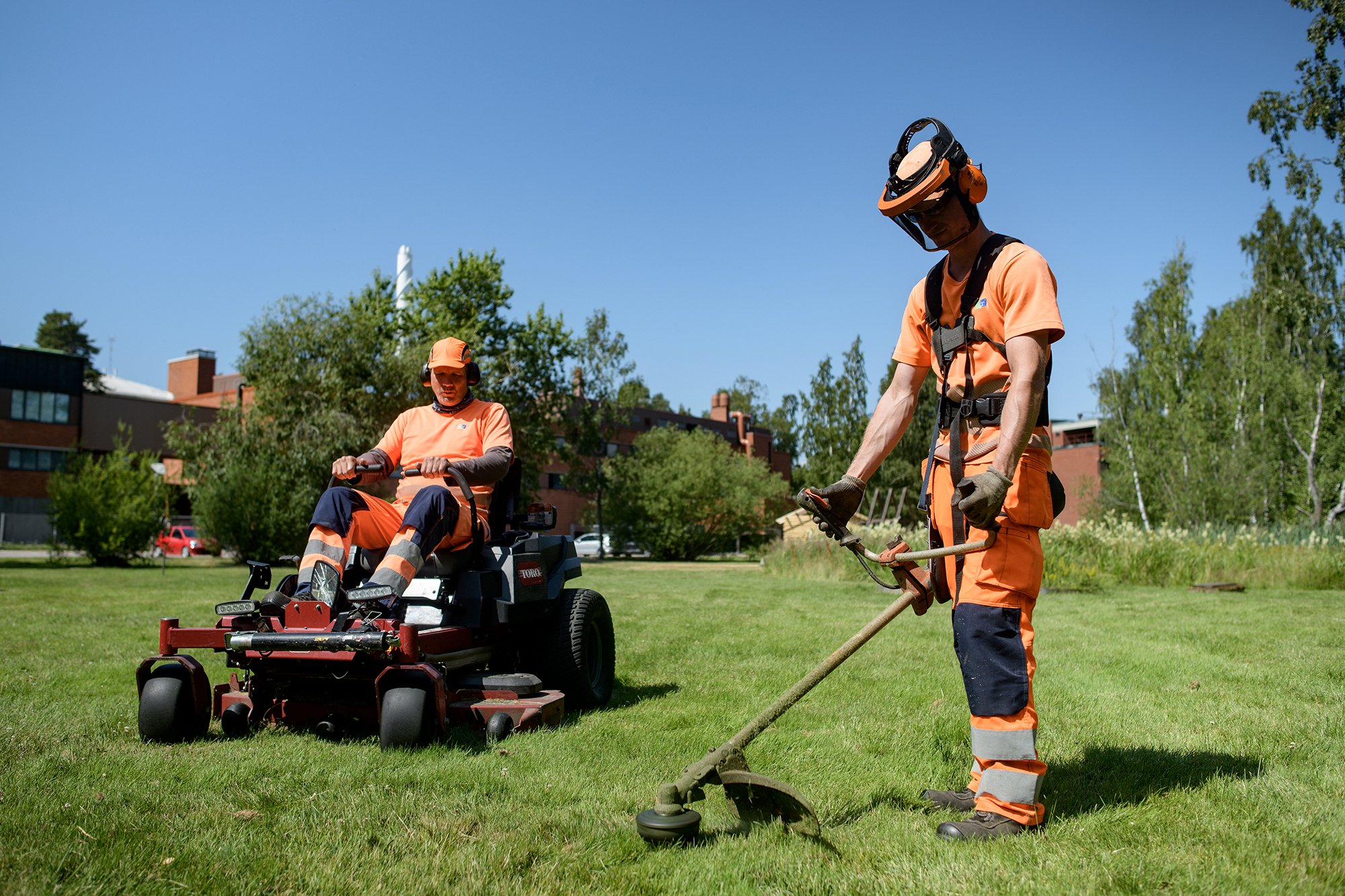 Petteri Lukka ja Pyry Melander L&T:n viherpalveluista leikkaavat nurmikkoa mittausalueella. Leikkuuta tehdään eri sykleissä ja erilaisilla koneilla.