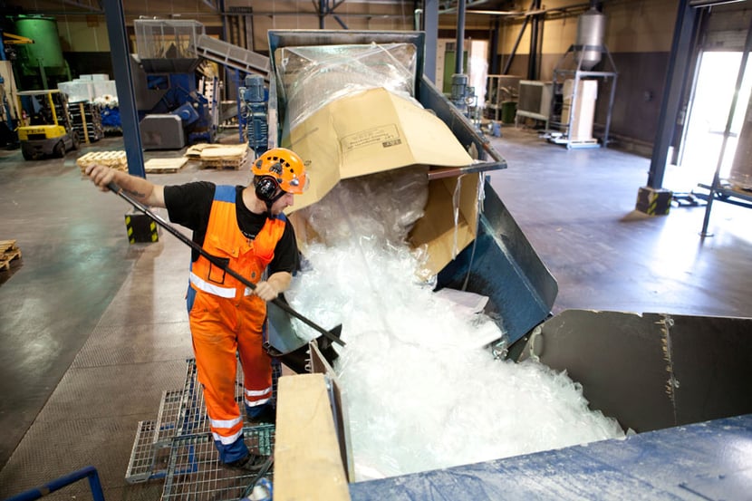 Kierrätysprosessi alkaa materiaalin puhdistuksella, lajittelulla ja murskauksella. Syntynyt rouhe syötetään hihnalle, jossa metallinpaljastin kertoo, jos joukkoon on eksynyt metallia.