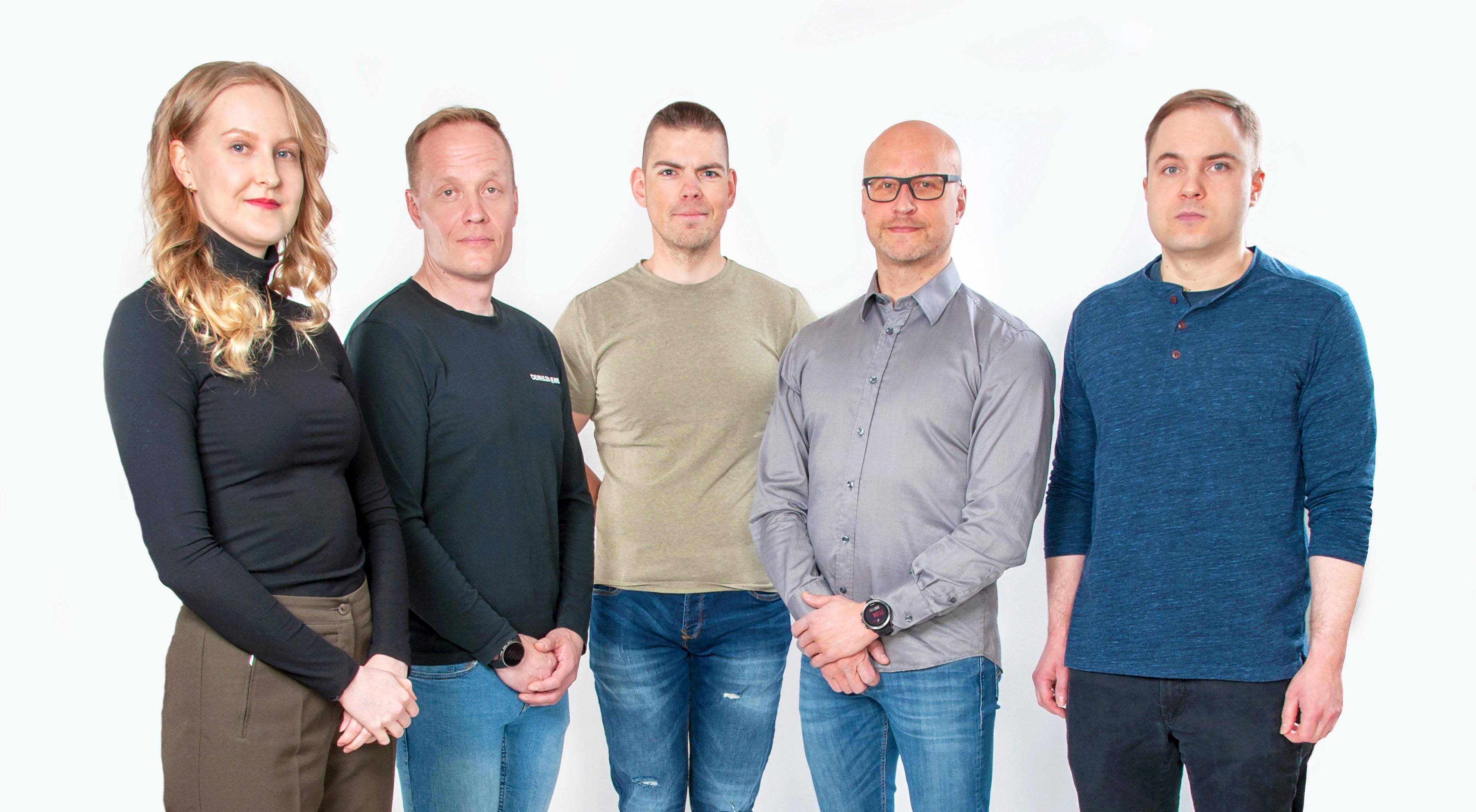 Kuvassa Smartti Automaation kehittäjät energia-asiantuntija Maria Halonen, tiimiesimies Jani Miettinen, energia-asiantuntija Niko Reinikka, palvelupäällikkö Jani Savolainen ja energia-asiantuntija Ville Rönkkö .