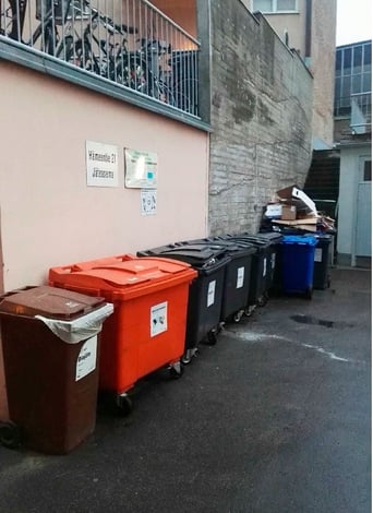 Saman taloyhtiön jätekeräyspiste TopLine-astiasuojilla.