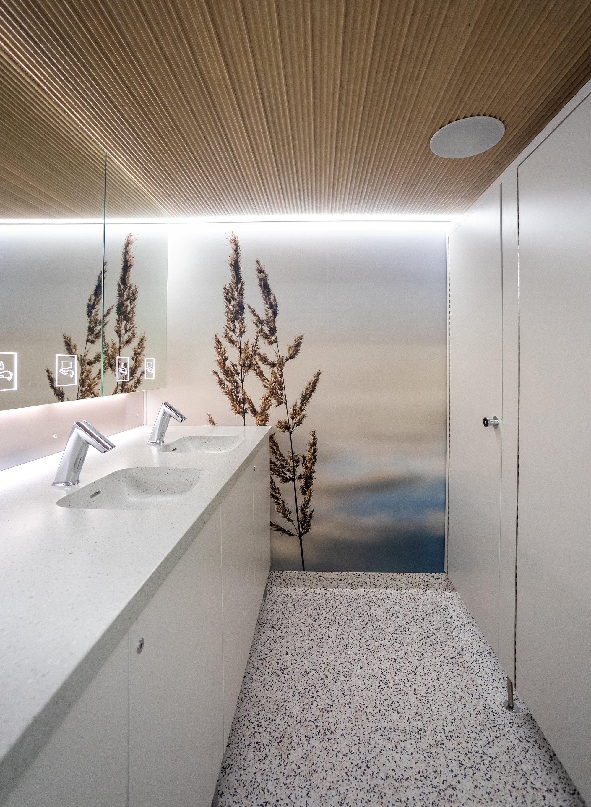 Luontoaiheiset seinäpaneelit vievät ajatukset suomalaiseen luontoon ja valaistut peilikaapit luovat avaruuden tuntua tilaan. Kattomateriaaliksi valittiin kotimainen puinen sisustuspaneeli, jonka ympärillä kiertävät led-valonauhat. WC-vaunun valaistus ja hanat toimivat liiketunnistimilla, mikä säästää sekä sähköä että vettä. WC-vaunu on heti toimituksen yhteydessä täysin käyttövalmis.