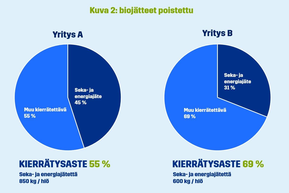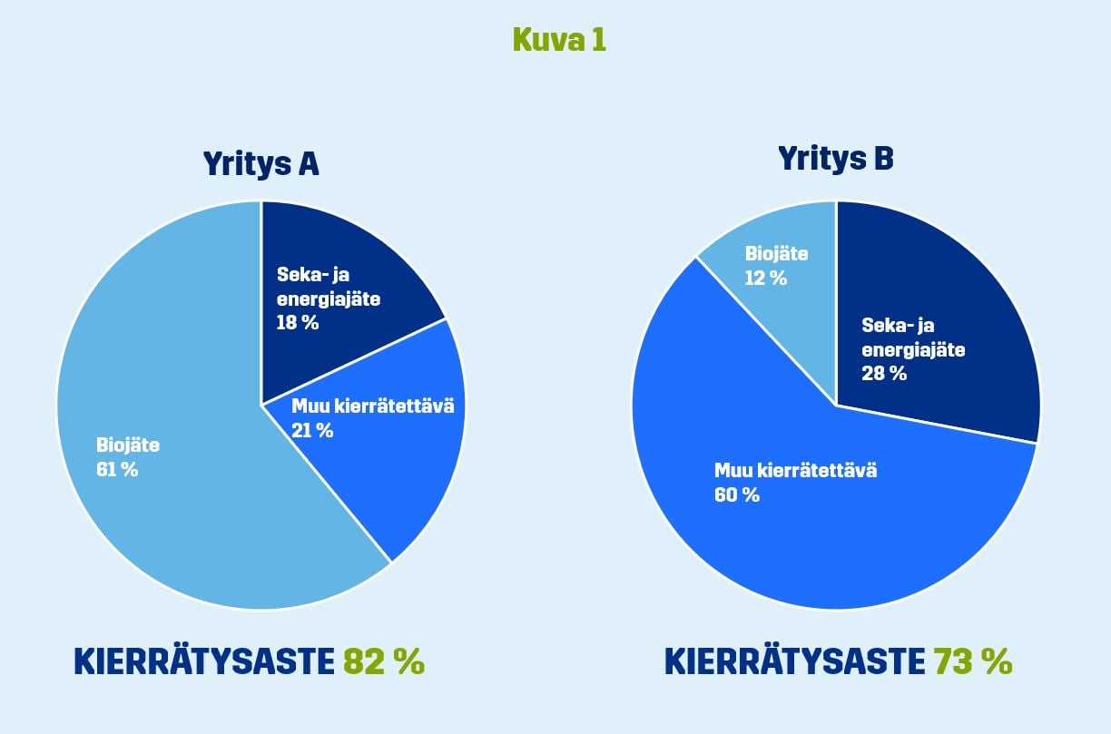 Kuvassa 1 Yritys A vaikuttaisi suoriutuvan lajittelusta Yritys B:tä paremmin. Tarkempi tarkastelu kuitenkin osoittaa, että Yritys A:n toiminnassa syntyy paljon biojätettä. Yrityksen A toiminta on sellaista, että biologisia sivuvirtoja syntyy paljon luonnostaan, ja ne on helppo ohjata kierrätykseen ilman, että asiaan tarvitsee kiinnittää erityistä huomiota.