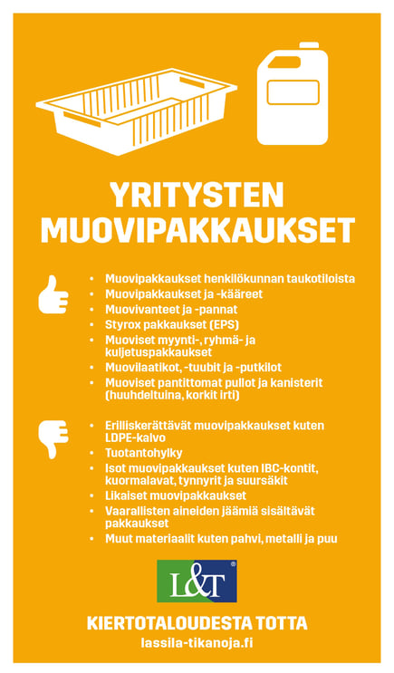 Tiesitkö, että muovipakkausten tuottajavastuu koskee myös yrityksissä syntyviä muovipakkauksia? Muovipakkausten erilliskeräys yrityksille on helppoa, ja mainio ympäristöteko onkin päivittää muovipakkausten lajitteluohjeet yrityksen toimipaikoilla. L&T:llä ympäristöjohtamisen tiimipäällikkönä työskentelevä Lilli Linkola tietää, kuinka oman yrityksen muovipakkaukset saadaan tehokkaasti kiertoon.