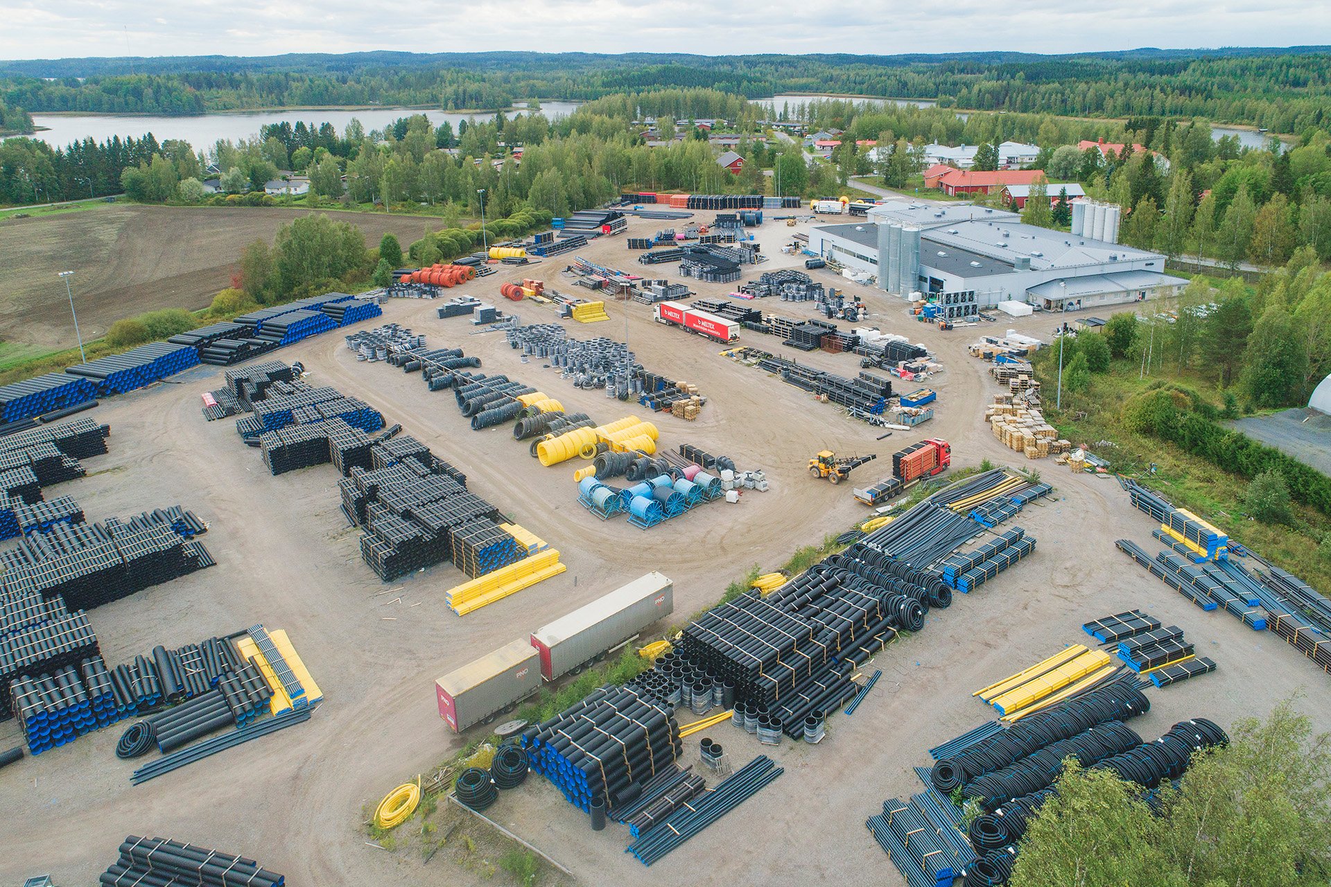 KUHMOINEN. Seven giant silos outside an industrial building contain 150 cubic metres of plastic granulate each. Ten production lines running in three shifts use the granulate as raw material to produce various kinds of plastic pipes at a volume corresponding to more than six million metres per year.