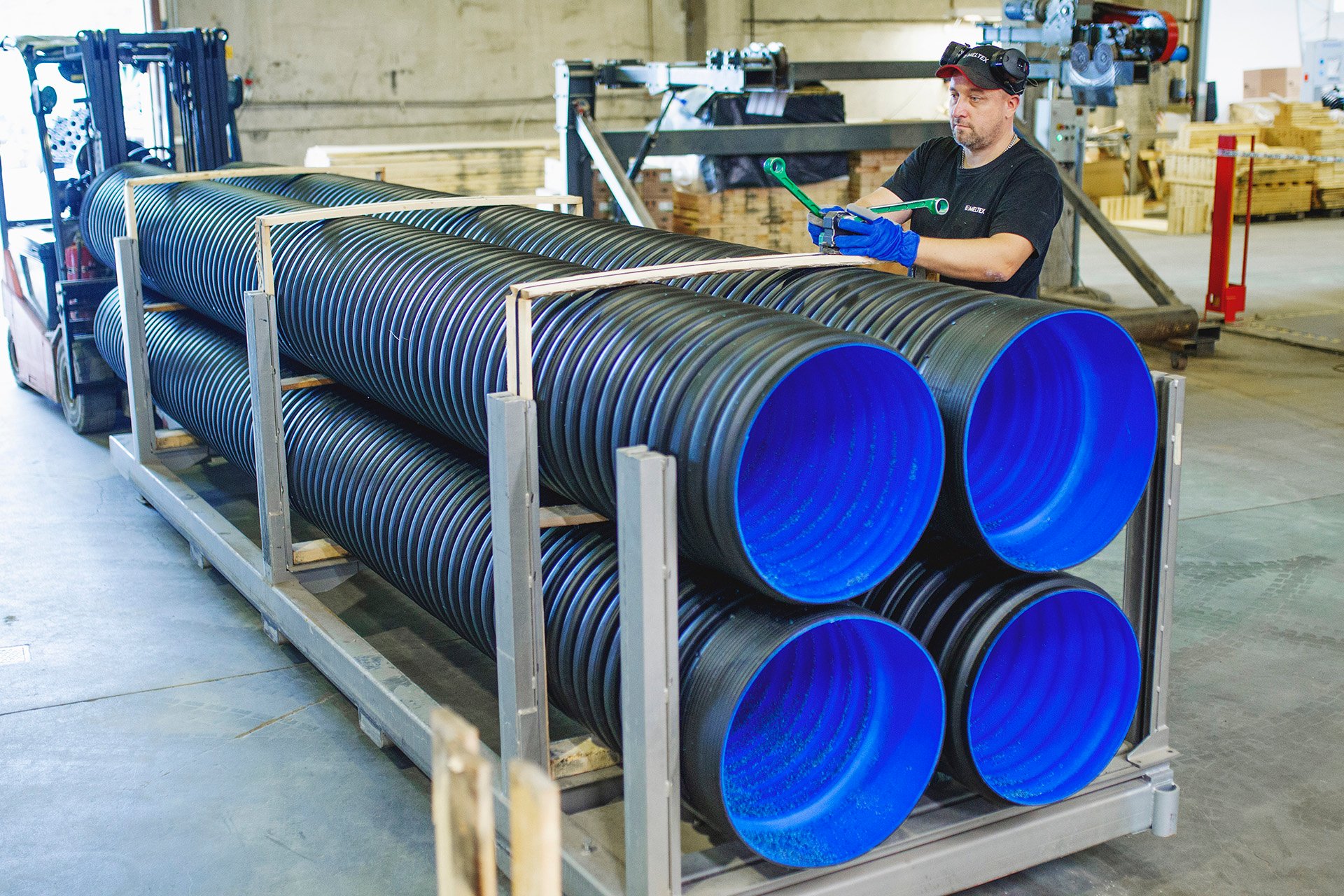 The raw material is weighed using a gravimeter at the start of the production line. The raw material then enters an extruder that melts them into a mass that is moved on to the calibration machine. It is a type of mould that shapes the mass into a pipe of the desired size. The pipe then goes through a cooling pool that is tens of metres in length. The pipe that comes out of the other end is about as warm as the human hand. The pipe is cut down to the right lengths and plugged at the ends. The product is now ready to be shipped out.