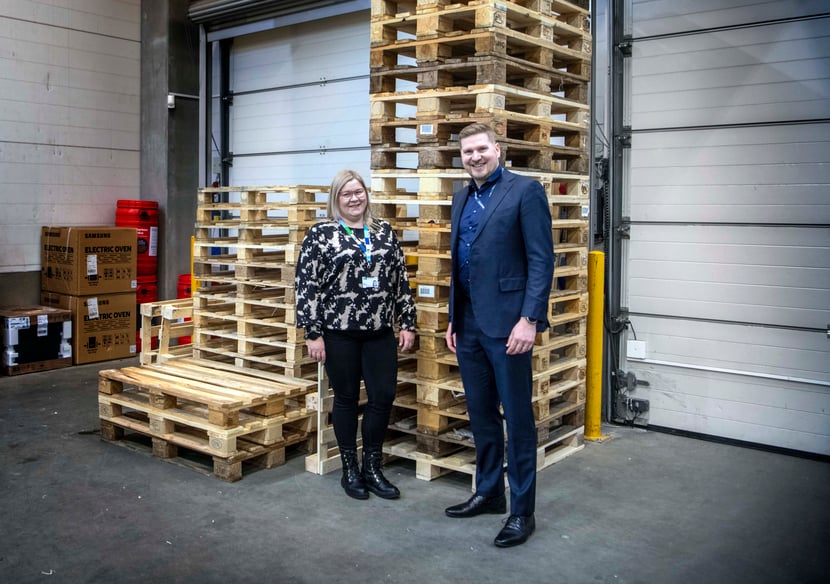 Viivi Palonen ja Raul Friman suunnittelevat uusia lajitteluosaamiseen liittyviä koulutuksia. Myös kuormalavojen kierrätys hoituu L&T:n kautta.