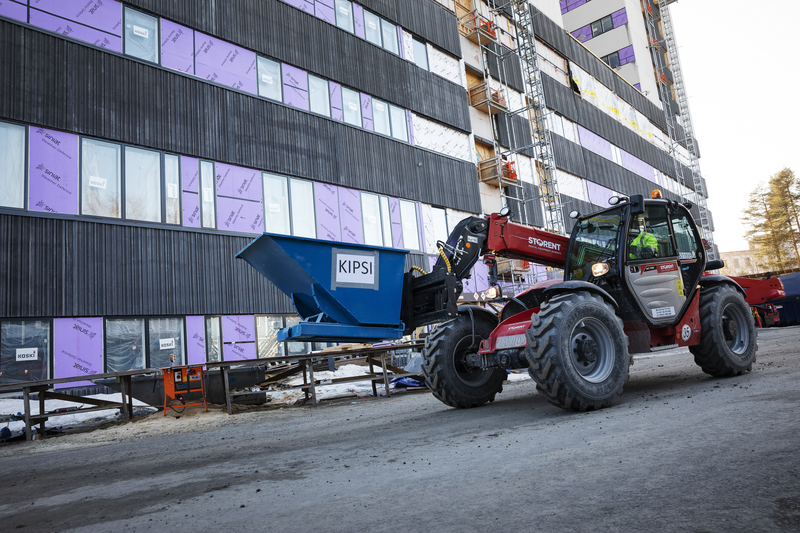 Ensimmäisen vaiheen A-talo kohoaa jo harjakorkeuteen, ja työmaalla on siistiä, niin ulkona kuin sisällä kerroksissa. Erilaiset jätteet löytävät tiensä oikeisiin astioihin ja sitä kautta tehokkaaseen kiertoon.