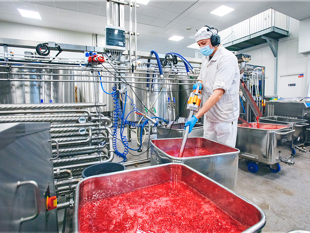 Tuotannossa leijuu huumavia tuoksuja: lakritsia, vadelmaa sekä paljon muuta, vaikeasti määriteltävää ihanuutta. Pannuista – kuten Saranpää isoja astioita kutsuu – putkistoista ja pakkauslinjoilta putkahtelee tällä hetkellä 27 erilaista jäätelömakua tuutteina, tikkuina ja purkkeina. Valikoima elää vuodenaikojen mukaan: syksyisin tehdään tummempia makuja, keväisin marjaisampia ja raikkaampia.