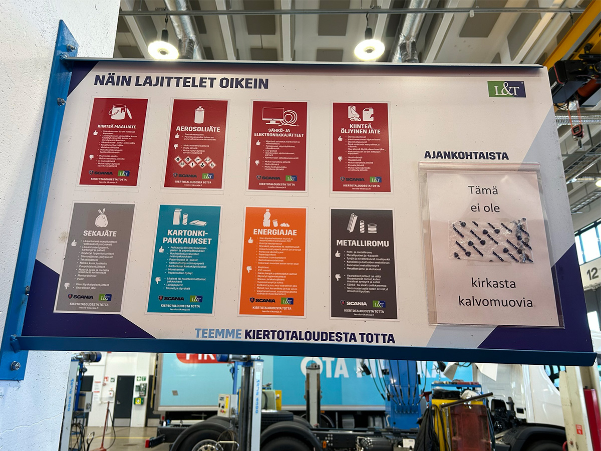 L&T huolehtii lähes kaikkien Scania Suomen toimipisteiden jätehuollosta ja vaarallisten jätteiden kierrätyksestä. Osalla toimipisteistä yhteistyö on jatkunut pitkään ja kumppanuutta on rakennettu pitkäjänteisesti. L&T:n ympäristömanageri Riikka Kinnunen kertoo, että Scanialla tavoitteena oli selkeyttää ja yhdenmukaistaa jätehuoltoa ja parantaa kierrätysastetta lajittelua lisäämällä ja sekajätteen määrää vähentämällä. Kehitystyön pohjana oli henkilökunnan ympäristö- ja lajitteluosaamisen sekä motivaation lisääminen koulutusten avulla.