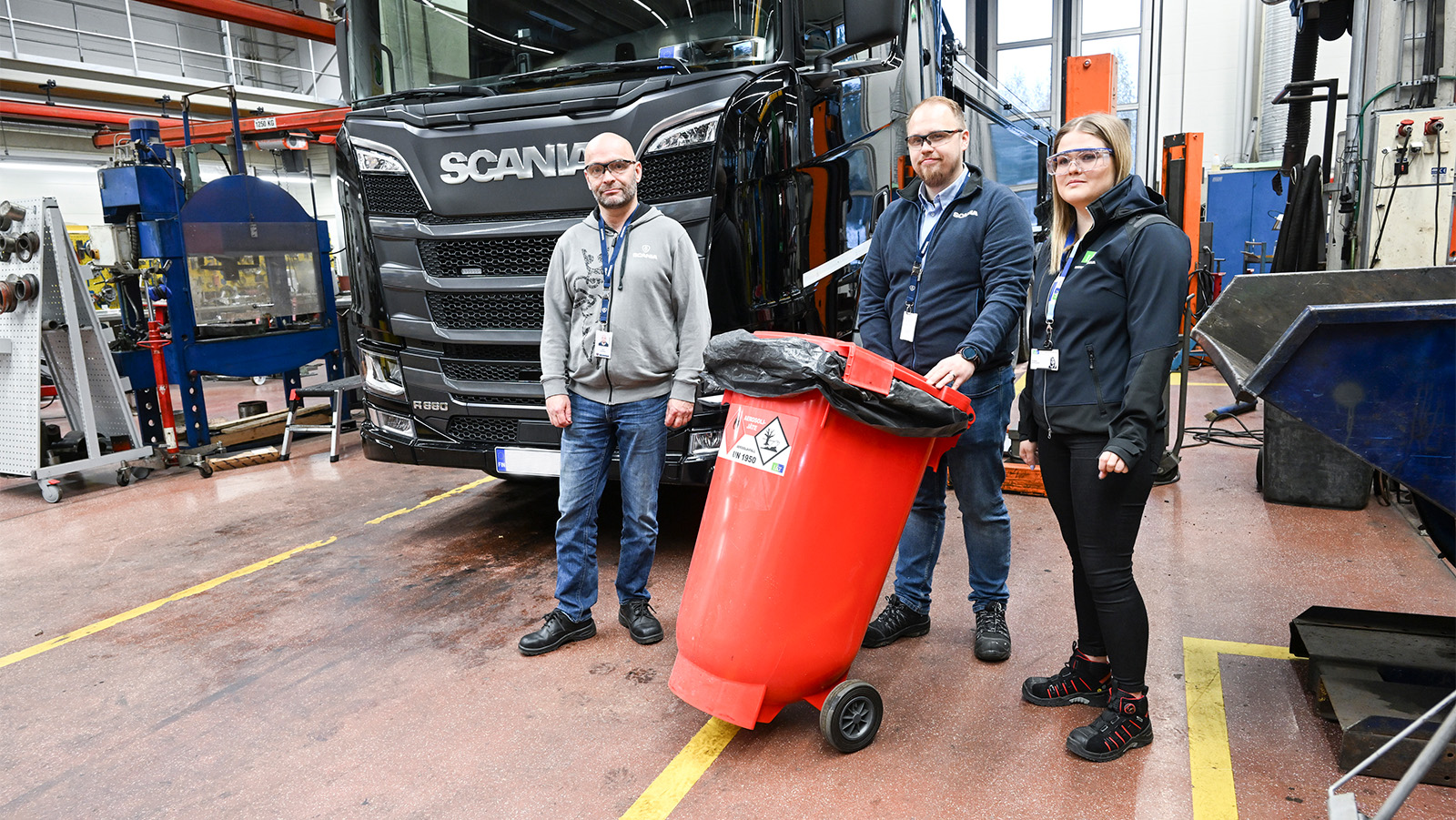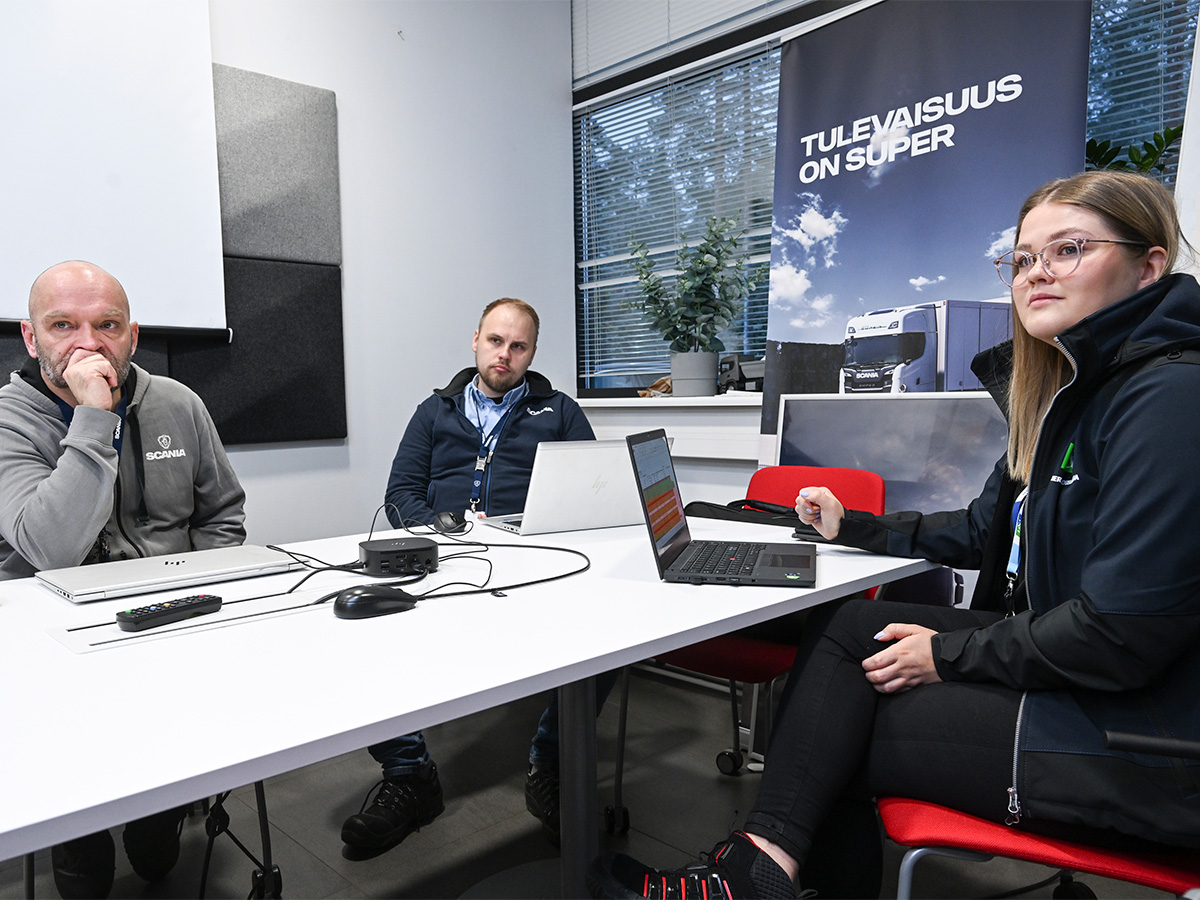 Jami Lustman (vas.) ja Henrik Kiviö ja Riikka Kinnunen ovat tavanneet säännöllisesti Scania Suomen jätehuollon päivittämiseen liittyvien katselmusten, kehitystyön ja koulutusten aikana.